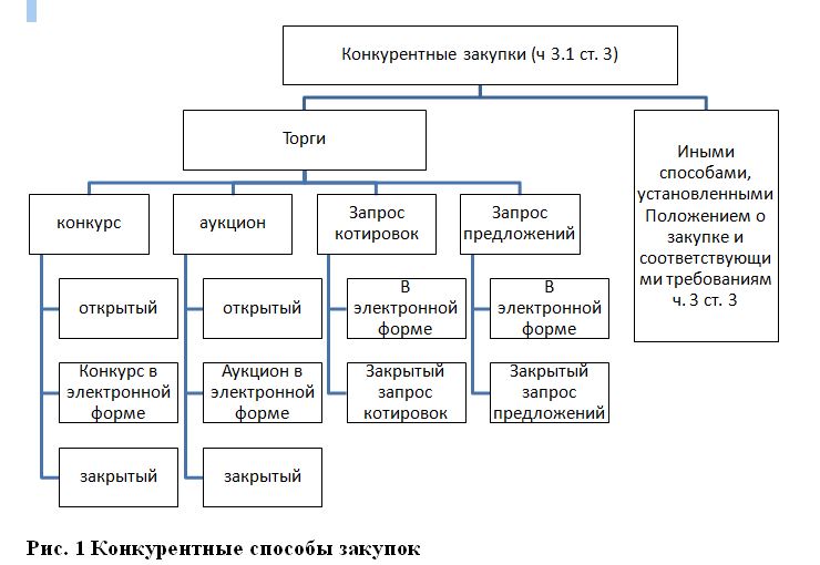 Конкурентные закупки заказчик может проводить способами, указанными на рисунке 1. Данный перечень конкурентных закупок обязательно должен быть отражен в Положение о закупке. Необходимо обратить внимание, что в соответствии с Законом 223-ФЗ - запрос котировок и запрос предложений являются торгами. Таким образом, статьи 447-449 Гражданского кодекса РФ распространяются не только на проведение конкурса и аукциона, но и запроса котировок и запроса предложений. В связи с этим не правомерно в Положение о закупке прописывать следующие нормы: «Запрос котировок (запрос предложений) не является торгами и не подпадают под регулирование статьями 447-449 части первой Гражданского кодекса Российской Федерации» или подобные данной.